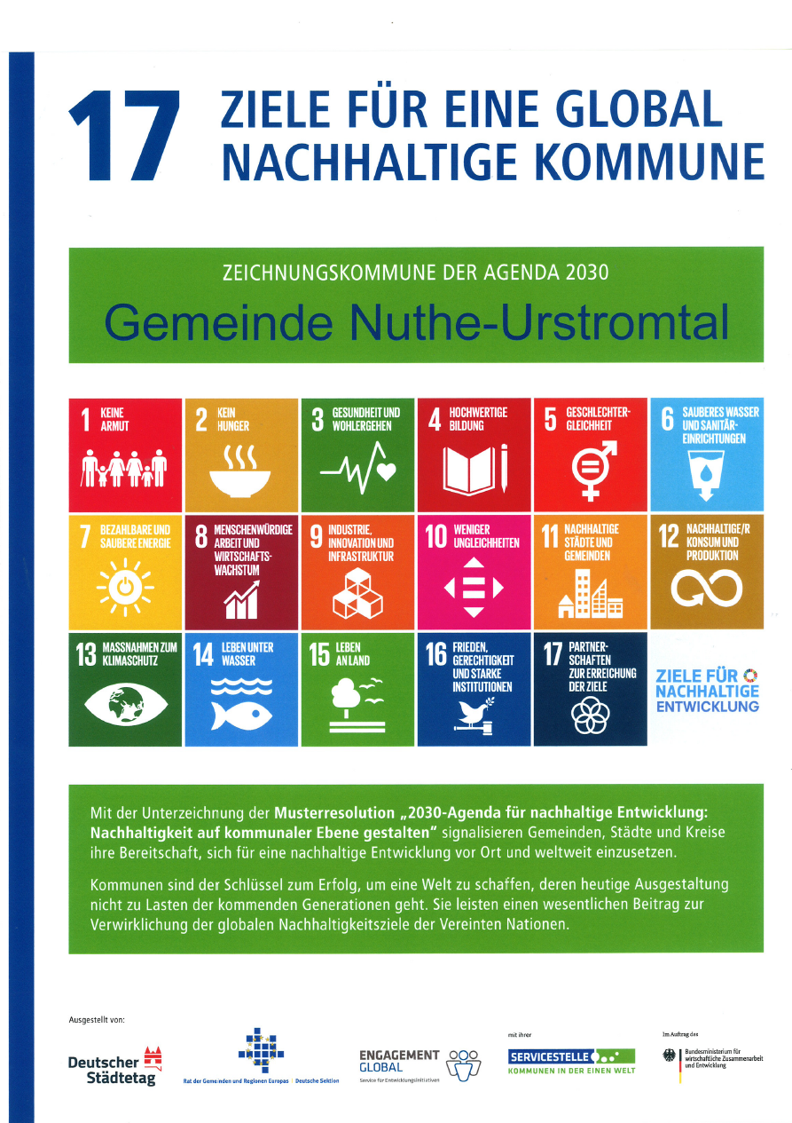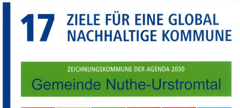 Um auf der lokalen Ebene, also vor Ort in der Gemeinde Nuthe-Urstromtal und in der Region, die nachhaltige Entwicklung umzusetzen, wurde am 23.03.2021 durch die Gemeindevertretung die Unterzeichnung der Musterresolution zur Agenda 2030 beschlossen. Damit ist Nuthe-Urstromtal eine von 140 Kommunen in Deutschland, die sich auf diese Weise öffentlich zu einer globalen Nachhaltigkeitspolitik bekennen.