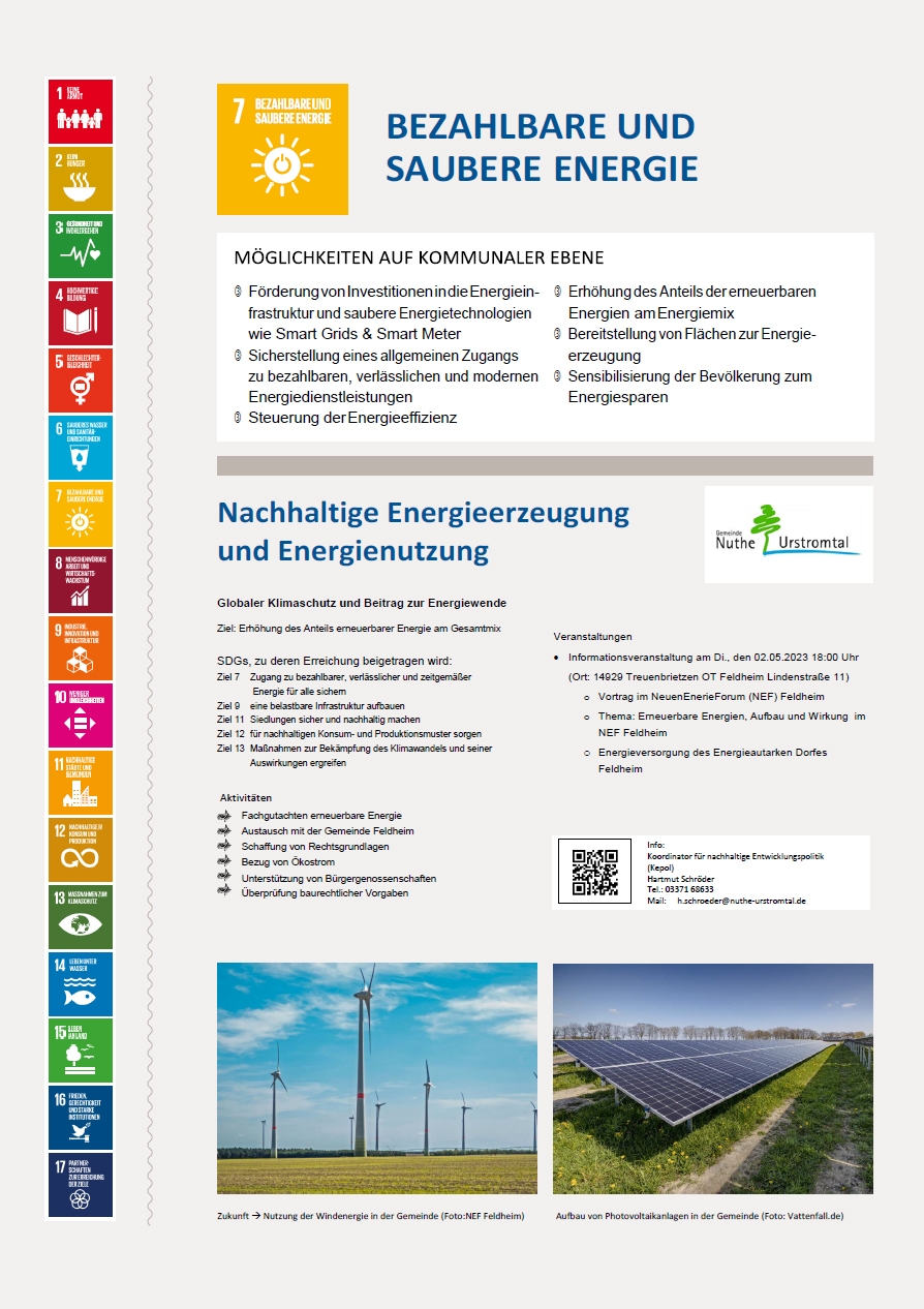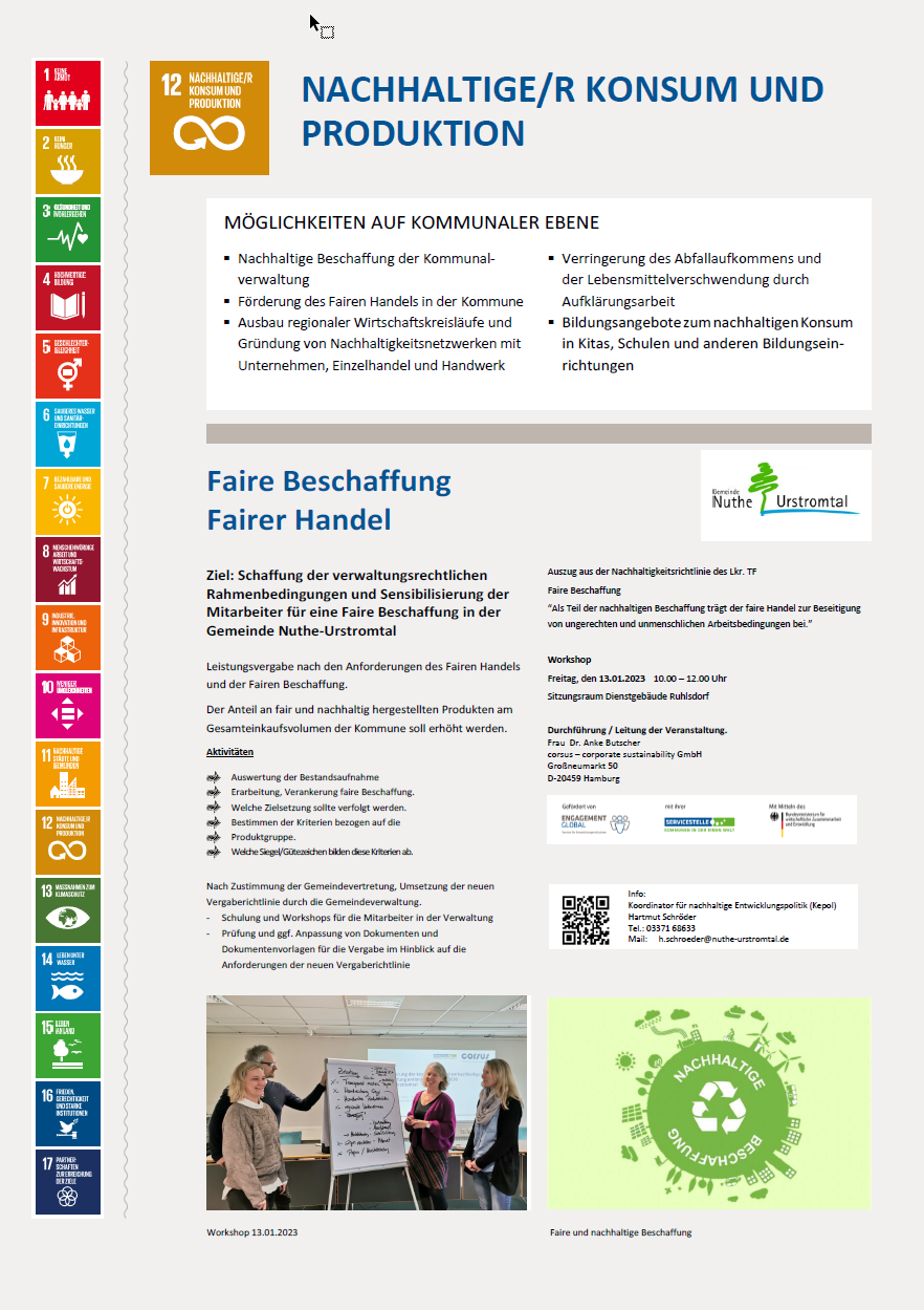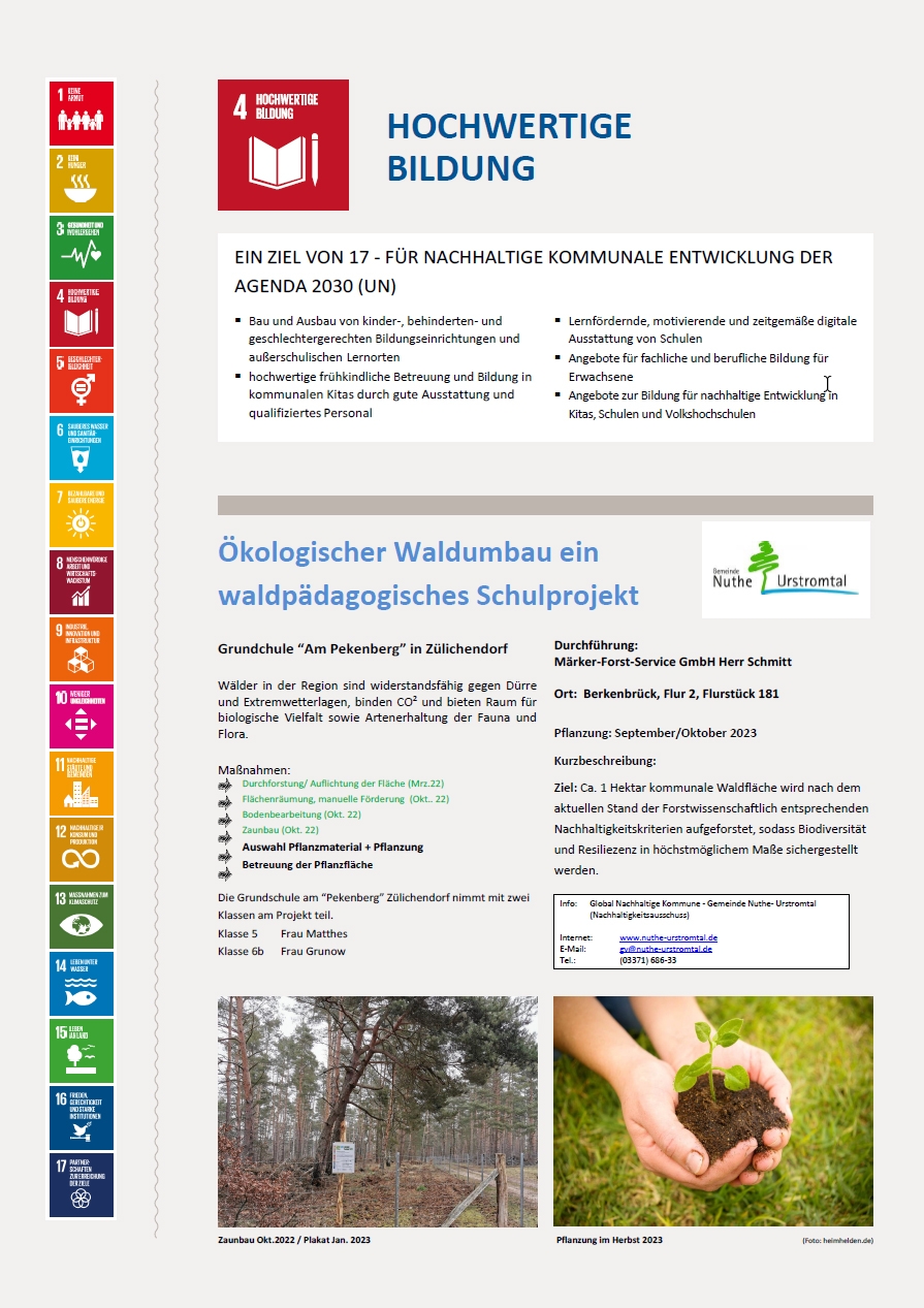 Am 30. April 2024 hat die Gemeindevertretung Nuthe-Urstromtal in ihrer Sitzung die Nachhaltigkeitsstrategie der Gemeinde Nuthe-Urstromtal beschlossen. Sie stellt das Ergebnis der Teilnahme am Projekt „Global Nachhaltige Kommune Brandenburg 2022-2023“ dar, ein Projekt der Servicestelle Kommunen in der Einen Welt (SKEW) von Engagement Global (EG) mit Mitteln des Bundesministeriums für wirtschaftliche Zusammenarbeit und Entwicklung (BMZ).